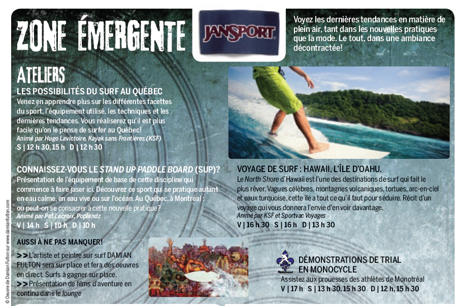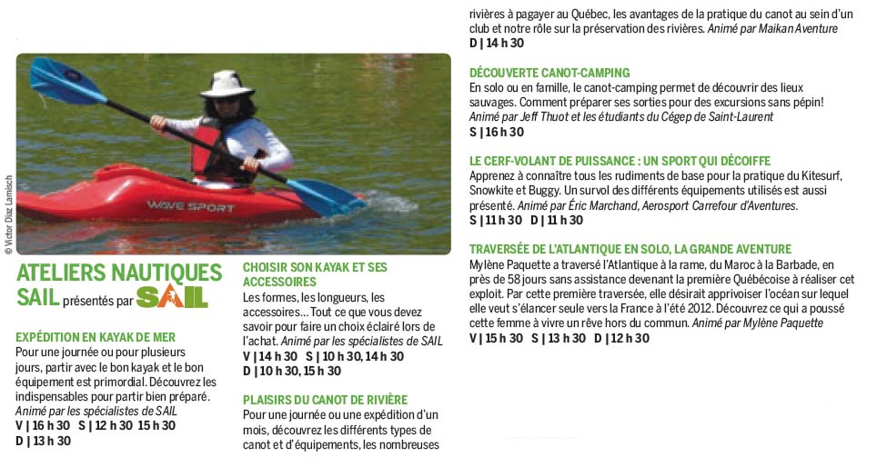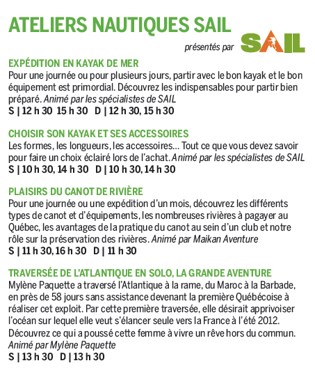 Exposants | Ateliers et conférences | Classes de maître | Structures dynamiques | Zone famille MEC | Compétition amicale des Rados Ecolos | Tendances | Nautique | Gardez la forme | Essais et animations